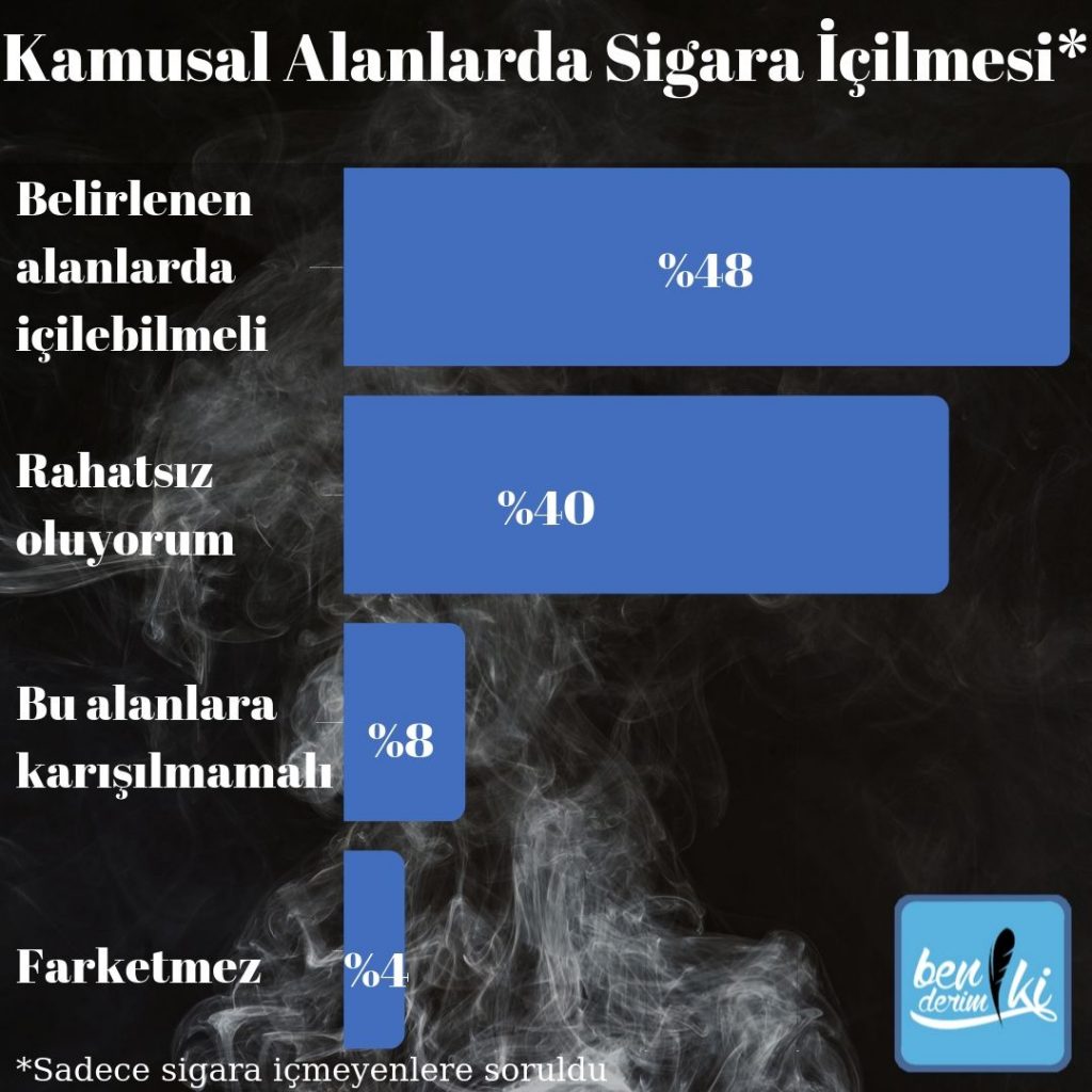 Sigara içenler her ne kadar çıkan yasalardan sonra çok kısıtlanmış olduklarını düşünseler de sigara içmeyenler için ne kadar rahatsızlık verdiklerinin çok farkında olmayabilirler. Öyle ki araştırmanın bir diğer sonucuna göre sigara içmeyenlerin yaklaşık yarısı park, sahil şeridi, orman, hastane bahçesi vb. yerlerde sadece belirlenen alanlarda sigara içilmesi gerektiğini düşünüyor. Sigara içmeyen her 5 kişiden 2’si ise bu alanlarda genel olarak sigara içilmesinden rahatsız oluyor.