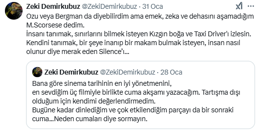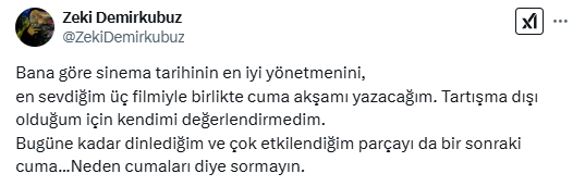 Demirkubuz, söz konusu paylaşımda "Bana göre; sinema tarihinin en iyi yönetmenini, en sevdiğim üç filmiyle birlikte yazacağım. Tartışma dışı olduğum için kendimi değerlendirmedim" ifadelerini kullanmıştı.