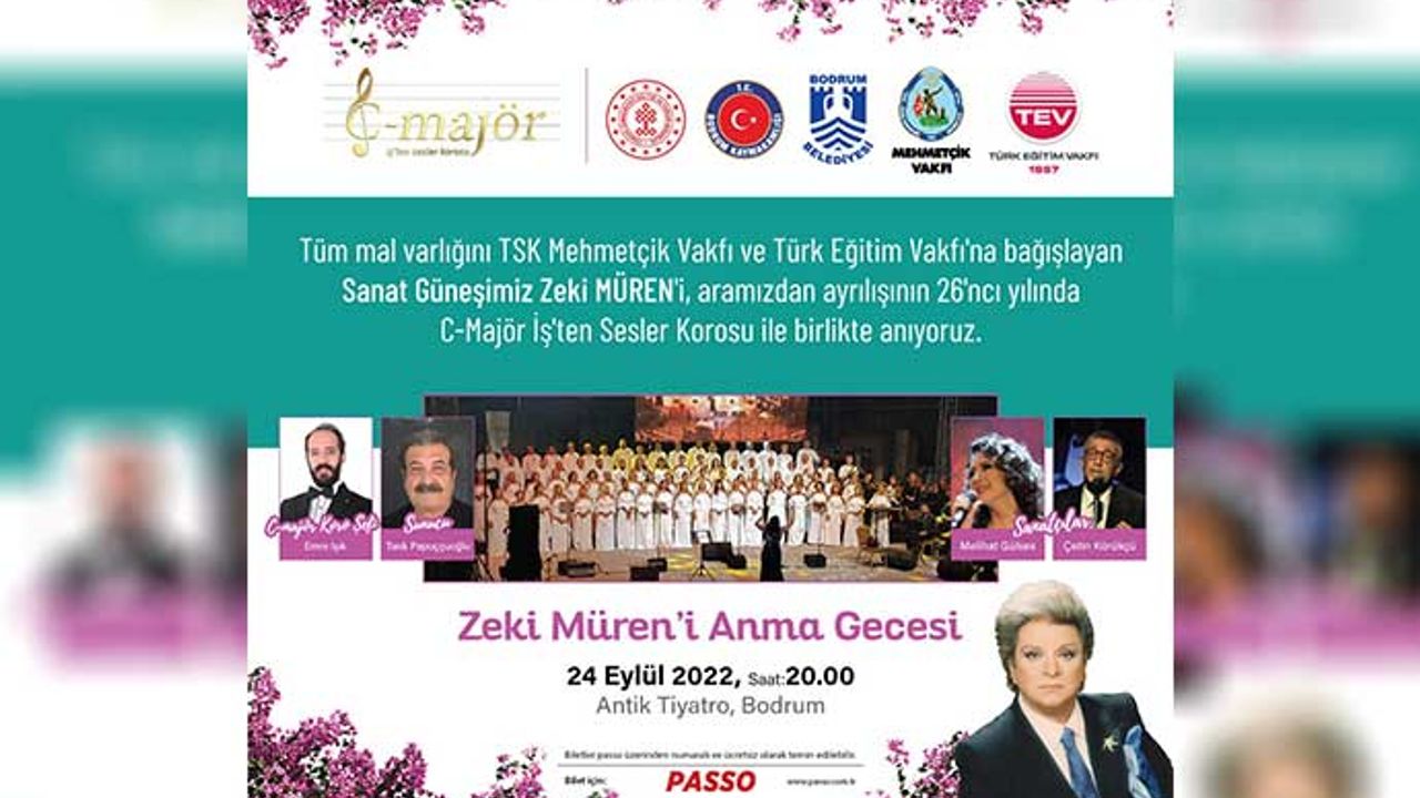 24 Eylül Cumartesi günü 14.30’da sanatçının Bodrum’da yer alan ve müze olarak kullanılan evinde halka açık mevlit okutulacak. Bodrum Belediyesi ev sahipliğinde gerçekleşecek konser ise Bodrum Antik Tiyatro’da yapılacak. Bu yıl 24 Eylül gecesi gerçekleştirilecek konserde 110 kişilik kadrosuyla C-Majör İş’ten Sesler Korosu sanatçıları yer alacak. Klasik Türk Müziği’nin usta isimleri Melihat Gürses ve Çetin Körükçü’nün sahne alacağı konserde, gecenin sunuculuğunu ünlü sinema ve tiyatro oyuncusu Tarık Papuççuoğlu üstlenecek. Gazeteci Nebil Özgentürk de Zeki Müren için hazırladığı belgeselden bir özet sunarak ve Zeki Müren’e ait bir şiir okuyarak etkinlikte yer alacak.
